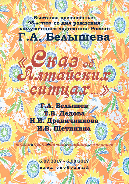 Данная выставка стала данью памяти замечательному художнику, организатору и руководителю художественной мастерской Г. А. Белышеву с 1962 года, передавшему свою уникальную профессию художника текстильного рисунка молодым. Полтора года назад Учитель ушел из жизни и его ученики решили, что юбилей обязательно нужно отметить памятной выставкой. И вновь расцвели Алтайские цветы на ситцах и сатинах.